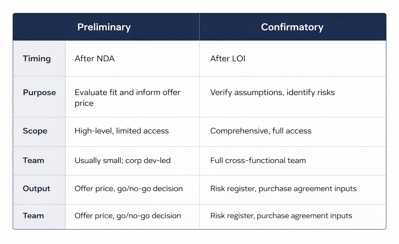 What is the difference between preliminary and confirmatory due diligence? Preliminary due diligence happens early in the process, after an NDA, to evaluate whether the deal is worth pursuing. Confirmatory due diligence happens after the LOI, when the buyer has committed to the deal in principle and is investigating the full scope of the business.