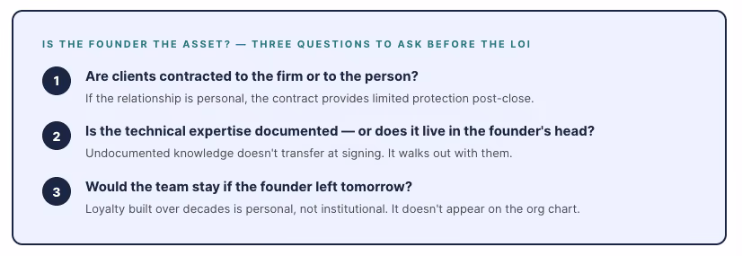Three questions reveal whether the founder is inseparable from the value being acquired.