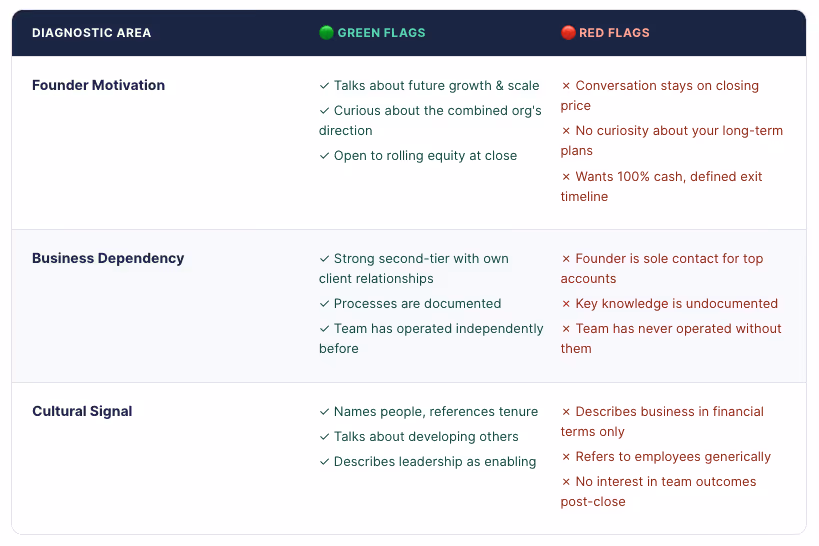 What does this founder actually want from the transaction? Are they building or exiting? This is not the same as asking them directly, because the answer in a negotiation is always going to be "I'm committed to the business and excited about the future." You're looking for behavior, not statements. Green flags show up in how they talk about what comes next. They ask questions about the combined organization. They want to understand your growth strategy and where their business fits. They show curiosity about how you operate and whether there's alignment in how decisions get made. They're open to equity rollover without pushing for 100% cash at close. These are signals that the finish line isn't the transaction — it's what happens after.