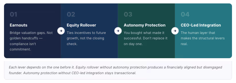 If the diagnostic tells you that founder retention is critical to the deal thesis, the next question is how to design retention that actually works. The mistake most teams make is assuming that structure solves the problem — earnouts, equity, employment agreements — without recognizing that retention is a sequencing problem. Getting the structure right without getting the relationship right produces compliance, not commitment. You end up with a founder who stays because they have to, not because they want to, and that difference shows up in every decision they make post-close.