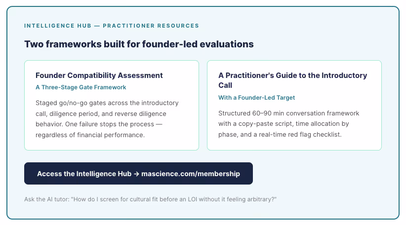 If you're currently evaluating a founder-led target, the Intelligence Hub has two frameworks built for exactly this stage — the Founder Compatibility Assessment: A Three-Stage Gate Framework and A Practitioner's Guide to Conducting an Introductory Call with a Founder. Both are built from practitioner conversations, not theory. Access them at mascience.com/membership.