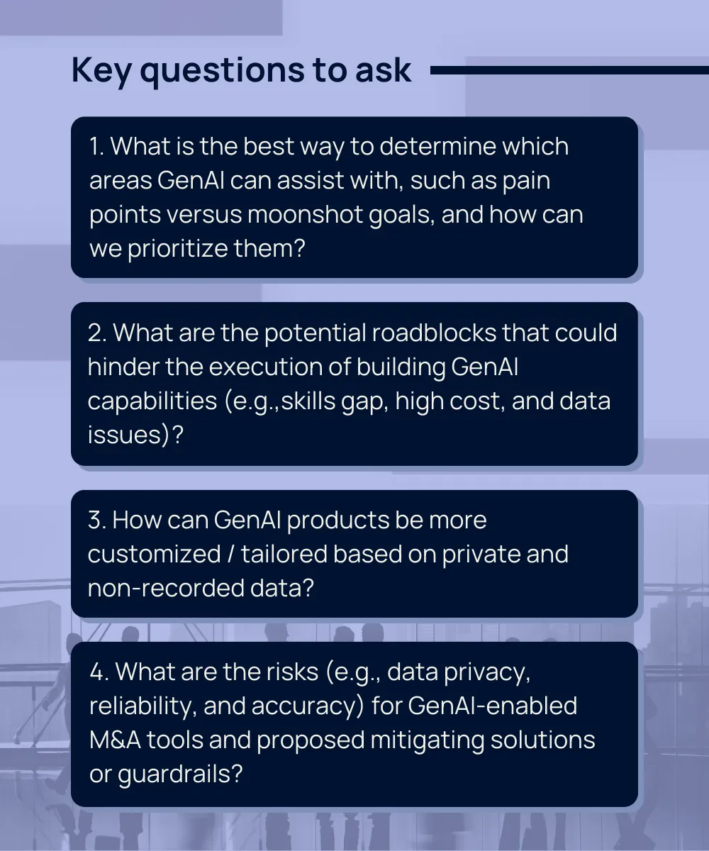 Currently, GenAI can assist by providing suggestions or ideas. However, due to the lack of access to private data and non-recorded data, GenAI can’t be relied on to develop a holistic M&A vision and corresponding strategy without human involvement. A couple of examples: