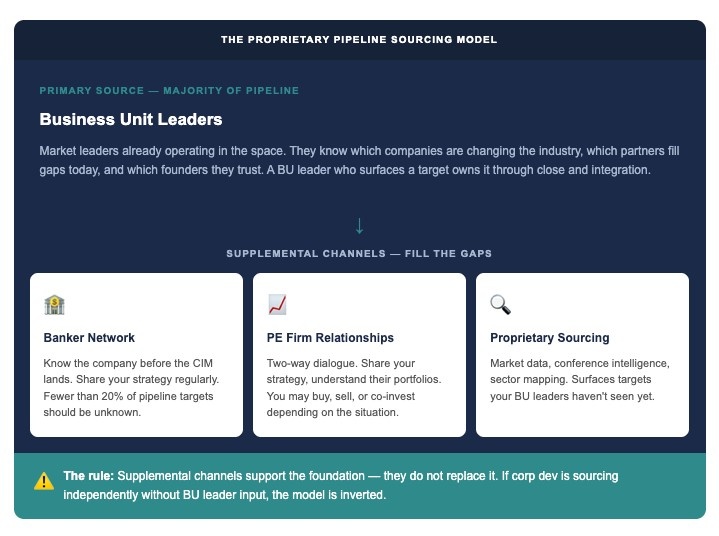 Most corp dev teams skip this internal work. They focus almost entirely outward — researching targets, taking external calls, building banker relationships — while the business unit leaders who should be their primary sourcing channel barely know what corp dev is working on. The internal relationship work is what makes the external work possible. Without it, you're sourcing in a vacuum.