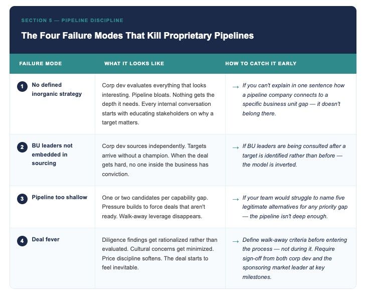 Pipeline too shallow. One or two candidates per capability gap creates pressure to force deals that aren't ready. When a deal feels like the only option, discipline breaks down on price, terms, and fit signals that should disqualify it. The fix is building depth before urgency: five to ten candidates per priority area, tracked over time, so you always have somewhere to walk to.