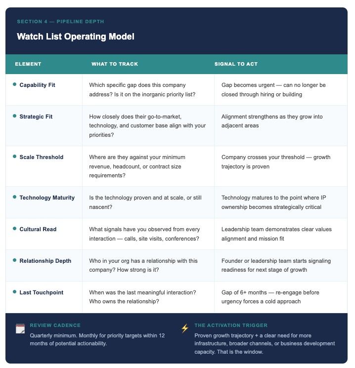 Pipeline depth also requires a long time horizon. Some targets don't meet your scale or technology thresholds today, but that’s not your cue to ignore them. It’s your cue to start tracking them. But a watch list is only useful if you know what to track and what triggers a move to active pursuit.