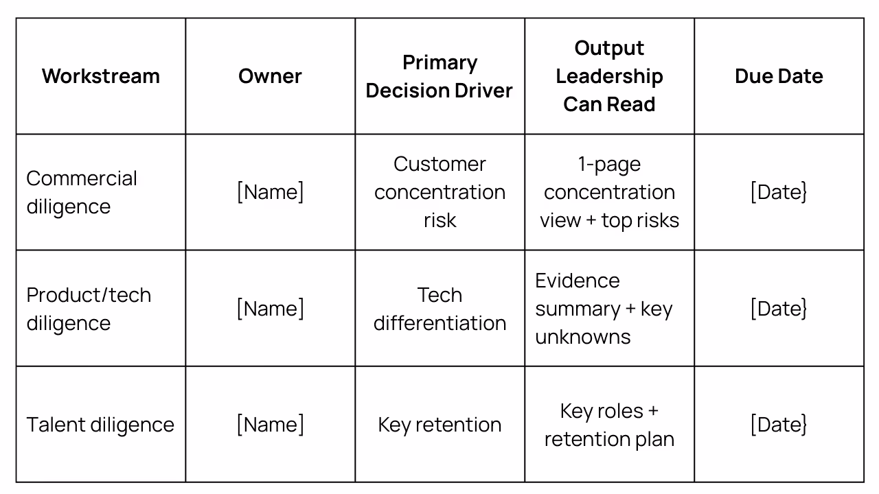 Require every workstream to tie to a primary decision driver, assign a single owner, and produce one leadership-readable deliverable on a deadline. If a workstream cannot name its decision driver or deliverable, it should not proceed in IOI-to-LOI scope.
