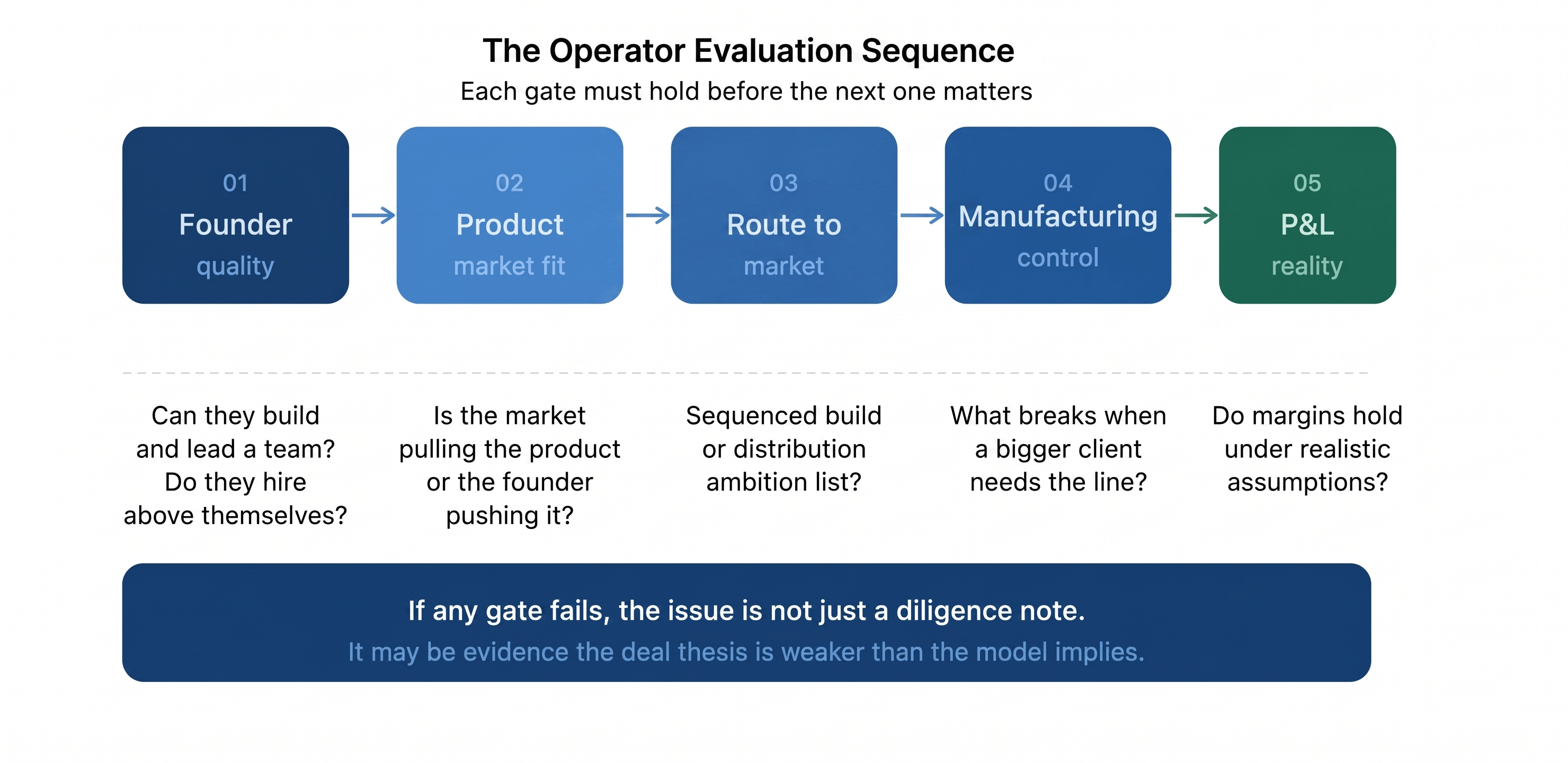The first filter is not gross margin or revenue trajectory. It is whether the person running the business can actually build and lead a team. Consumer brands are often founder-led to a degree that creates real dependency risk: the founder is the key customer relationship, the main sales driver, the product decision-maker, and the culture. If that person cannot scale their leadership range or is unwilling to hire people stronger than themselves in critical areas, the business has a ceiling the model does not reflect.