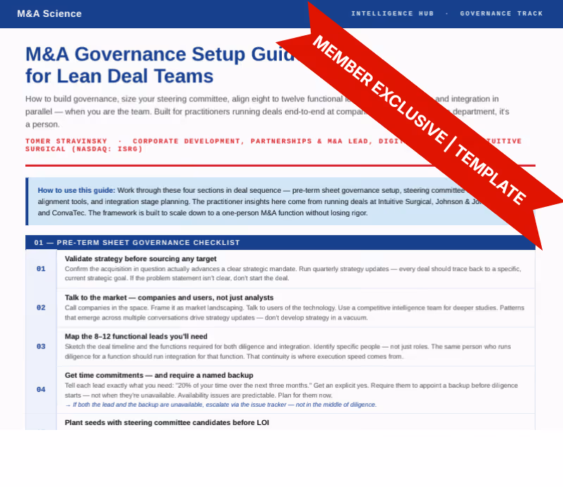 Built for corporate development leaders and integration owners who need a clear governance structure — from deal team formation through steering committee. If decisions in your deals slow down after LOI, this is the course.
