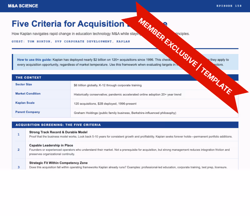 Tom Horton is Senior Vice President of Corporate Development and Strategy at Kaplan, where he leads a three-person team overseeing M&A, equity investments, and strategic planning across Kaplan's global education portfolio. Over eight years at Kaplan, he has operated within a Graham Holdings investment framework shaped by Warren Buffett's influence, guiding a program that spans 120 acquisitions and nearly $2 billion in deployed capital since 1996.