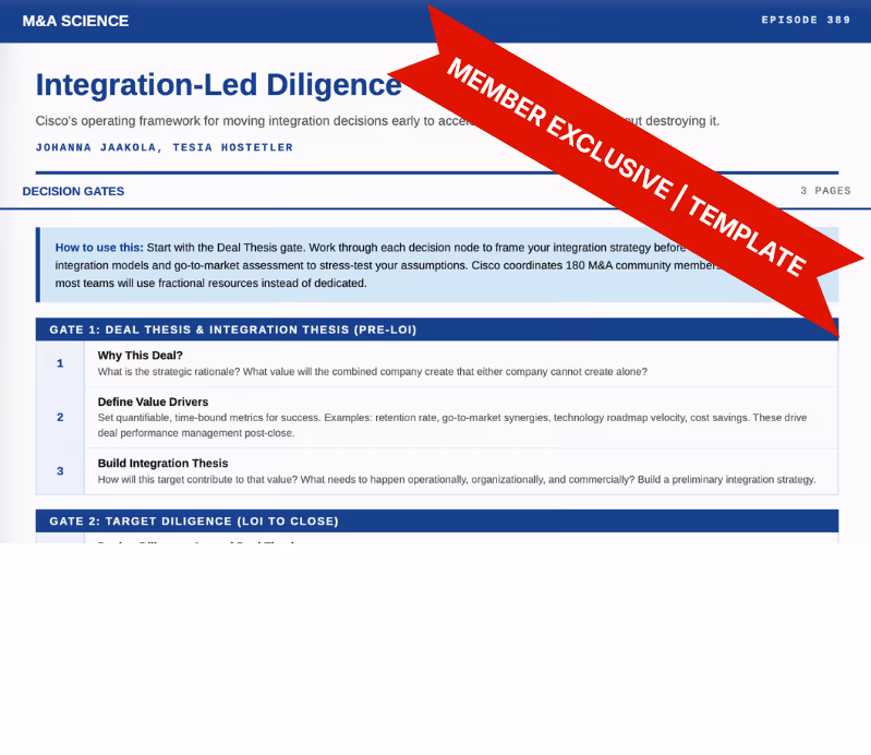 This course is for integration leaders, corporate development professionals, and M&A practitioners at companies that do deals regularly and want to move beyond reactive integration. If your team is still pulling in integration two weeks before close, or running diligence and integration as separate workstreams, Johanna and Tesia show you what a mature, integration-led model looks like in practice — with real lessons from Cisco's approach to some of the most complex acquisitions in the industry.