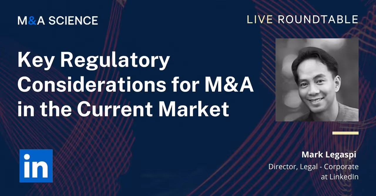 M&A activity has definitely slowed down. Due to economic uncertainty and high-interest rates, companies are hesitant to expand during these times. In addition, executing deals has also become more difficult due to regulatory changes, especially in the tech industry. In this episode, Mark Legaspi, Director, Legal - Corporate at LinkedIn, discusses key regulatory considerations for M&A in the current market.